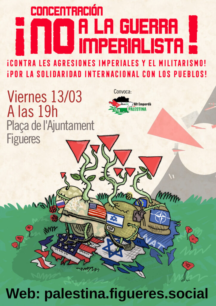 En respuesta a la reciente agresión militar contra Irán lanzada por los Estados Unidos de Norteamérica y el régimen sionista de Israel, que ha desembocado en una verdadera guerra regional con consecuencias para todo el mundo, así como en condena de otros ataques perpetrados -sólo en lo que llevamos de 2026- contra pueblos del Líbano, Venezuela, Cuba, Yemen, la R.D. del Congo y, naturalmente, Palestina, entre muchos otros, convocamos para viernes 13 de marzo una concentración en la plaza del Ayuntamiento (Figueres) para denunciar la escalada belicista, la militarización de los estados, el auge reaccionario, el intervencionismo criminal y las crisis humanitarias y masacres provocadas por estas y otras potencias.